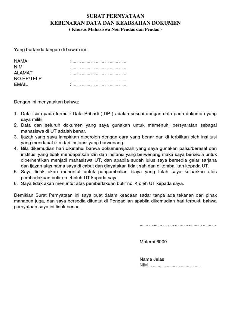 Http Www Ut Ac Id Images Katalog 2015 Katalog Sistem Penyelenggaraan Non Pendas Ut 2015 Pdf from Pak,saya mau tanya apakah bisa bikin surat kuasa sekaligus untuk pengambilan dan. Bagi calon mahasiswa ut 2021 akan menemui hal baru, yakni dengan kebijakan tersebut. Ada contoh surat pernyataan kesanggupan, surat pernyataan kerja, surat pernyataan menikah, surat pernyataan sikap, dan lain sebagainya. (…) surat pernyataan kebenaran data dan. Hasil seleksi pemilihan mahasiswa berprestasi (pilmapres) tingkat ut 2021. Contoh surat pernyataan kebenaran dokumen surat pernyataan. Data dan seluruh dokumen yang saya gunakan untuk memenuhi persyaratan sebagai mahasiswa di ut adalah benar. Seperti apa contoh surat pernyataan yang benar?
